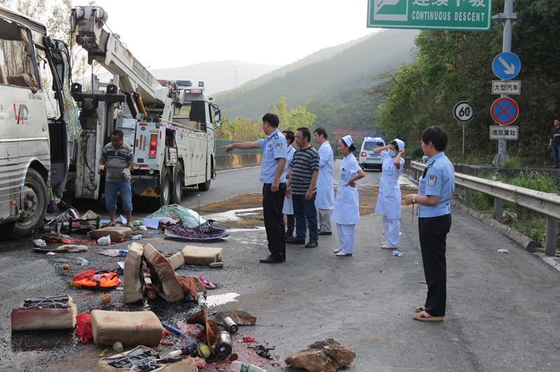 16时23分,元江县公安局110接到群众报警,现场处置警组于16时48分到达事故现场。5辆救护车于16时55分到达现场并及时救治伤员。之后,其中1辆救护车及一辆警车将8名驾乘人员送至玉溪市人民医院医治,其余4辆救护车将24名乘客送至元江民族医院医治,伤员于17:30分全部转运完毕(车上有4名乘客没有受伤)。施救部门派出1辆大型拖车、1辆大型吊车赶赴现场,于17时20分到达现场进行施救,于18时55分将肇事客车施救完毕,现场滞留车辆恢复通行。19时10分,下行线扬武立交解除交通管制,恢复正常通行。