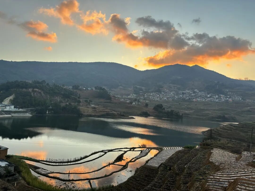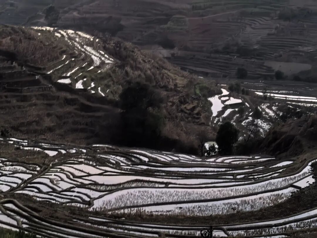 午后云散,梯田的曲线清晰舒展,万亩水田倒映天光,田埂如墨线勾勒的精致纹路。