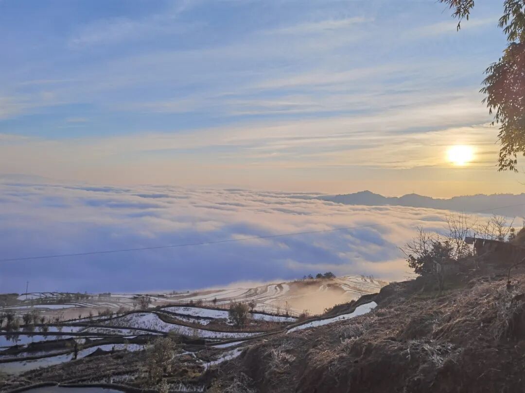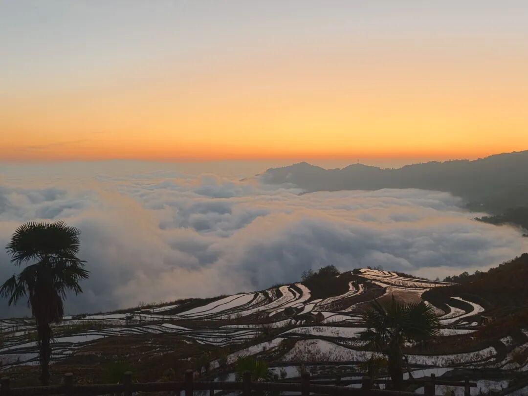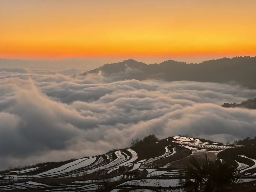 晨雾初起,云雾如轻纱漫过山谷,层层梯田似天梯垂落人间。朝阳穿云破雾,金光洒在云涛与水面上,云海泛橘,梯田鎏金,哈尼村寨半隐其间,炊烟与云气交织,恍若误入瑶池。