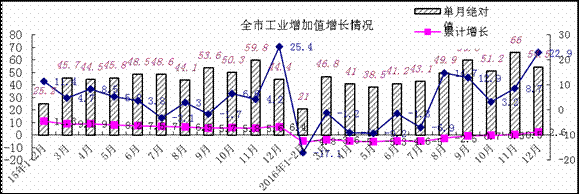 2016年,全市工业完成全部工业总产值1673亿元、增长6.8 %;工业增加值632亿元,增长3.0 %。规模以上工业完成总产值1344.4亿元,增长6.4%;增加值597.3亿元,增长2.6 %。增速2.6%比一季度提高6.2个百分点,比上半年提高7.2个百分点,比三季度提高3.3个百分点。