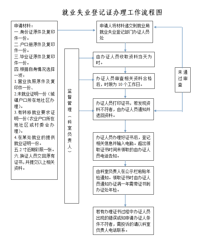 审批程序:个人提出申请及提交相应材料,工作人员在10个工作日内,对申请人提交的材料进行审核,对符合办证条件的发给《就业失业登记证》,对不符合办证条件的说明理由,退回申请材料。